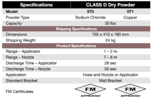 MODEL 570 contains a unique blended Sodium Chloride-based dry powder extinguishing agent. The heat from the fire causes it to cake and form a crust excluding air and dissipating heat from burning metal. Metal fires involving magnesium, sodium, potassium, and sodium-potassium alloys, zirconium, uranium, titanium, and powdered aluminum.