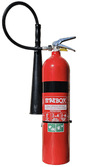 Carbon Dioxide (CO2) Fire Extinguishers are distinguished by a black coloured band around the top of the cylinder.