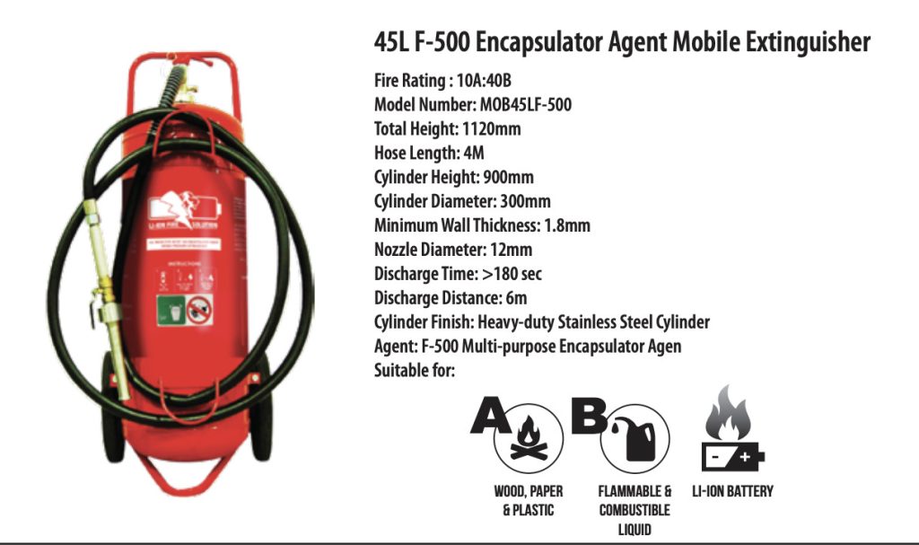 - F-500 EA (Encapsulator Agent) — a high-performance firefighting agent that works by rapidly cooling, encapsulating fuel particles, and preventing re-ignition. F-500 is increasingly used by emergency services for lithium battery fires due to its ability to disrupt the thermal runaway process.